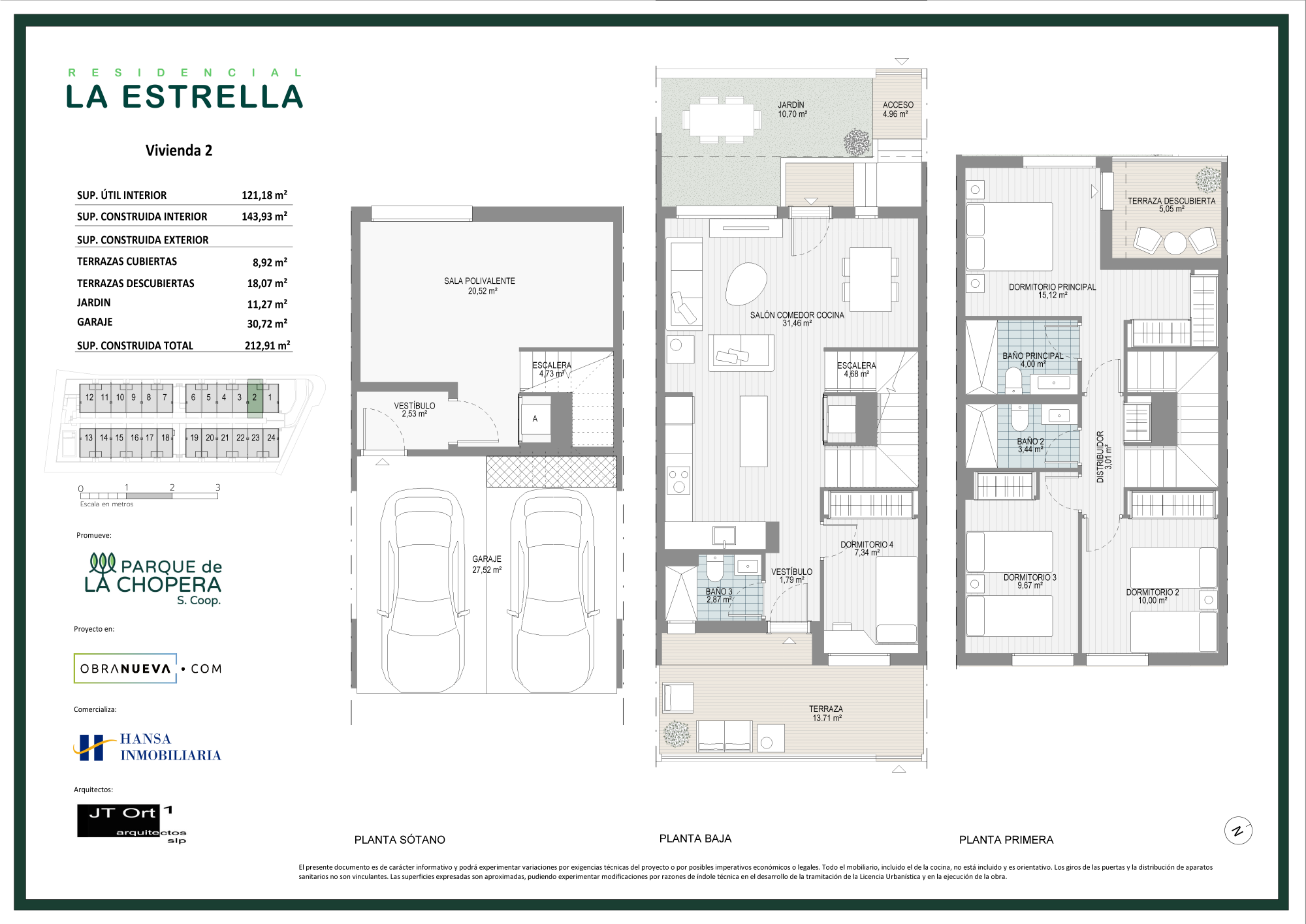 4 dormitorios, 3 baños, terrazas, jardín privado, semisótano con ventilación y luz natural, y garaje para dos coches.